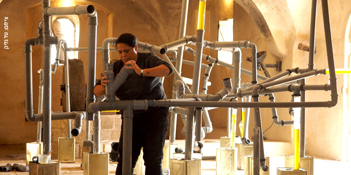 From the dowry blanket the exhibition passes to the museum’s archaeological garden, where two site-specific installations – “Bukgeh (the bundle), 2019” and “In Between the Destruction of the Father, 2019” have been constructed in the flour-mill and the oil-mill. The installations bring women’s work into two institutions that have traditionally been the domain of men in Arab society, and also create an encounter between the two peoples’ histories, since the location of the museum garden is close to the site of the Palestinian village of Sheikh Munis (الشـَّيْخُ مُوَنِّس), while the oil-mill and the flour-mill are reconstructions in the spirit of Palestinian structures. The encounters and power relations reflected in the artist’s works seem like a reflection of the archaeological and contemporary stratigraphy of our life.