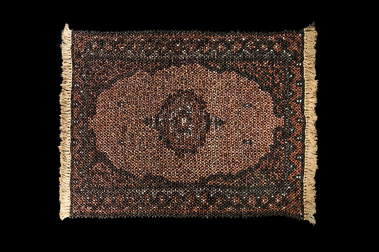 This work is composed of tuff stones and gravel in various natural tones, which were collected in gardens and squares on the margins of public parking lots throughout the country. The stones were classified, perforated, and finally beaded into an arrangement resembling a patterned rug. From a distance, the rug resembles a traditional woolen weave. Upon closer examination, it is surprisingly revealed to be made of a crude, cheap material – the byproduct of a volcanic eruption that mostly serves to decorate or cover the earth.