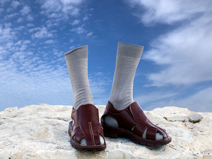 "גרביים וסנדלים", כשם אחד מתצלומי התערוכה, הם סימן היכר מובהק של עולים חדשים בישראל. דבר לא ישכנע אותם להסיר את הגרביים ובוודאי שלא את הסנדלים – גם לא 40 מעלות בצל.