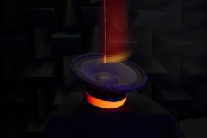 מיצב סאונד רב-ערוצי מותאם חלל, מרכז אדם ועמלו; 15 רמקולים ומיקרופון אופטי הנשלטים על ידי תוכנה. באדיבות אופטואקוסטיקס בע"מ, ישראל
