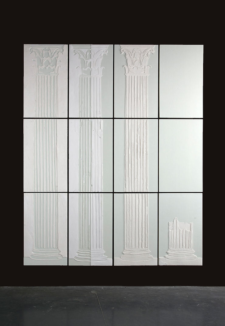 "רצף של תבליטי גבס גדולי מימדים שנוצרו בטכניקה ייחודית אותה אני המצאתי. ביחד רצף התבליטים מציג 'מחזור חיים' של עמוד קורינתי (מהסדר הקלאסי של עמודי מקדשים ביוון העתיקה) בארבעה שלבים – העמוד 'כלוא בתוך בלוק'; חציו האחד של העמוד 'כלוא בתוך בלוק' וחציו השני 'חולץ מהבלוק'; כמו לידת ונוס, העמוד 'חולץ מהבלוק’ ועומד מלוא תפארתו; גדם בלבד נותר מהעמוד המפואר.