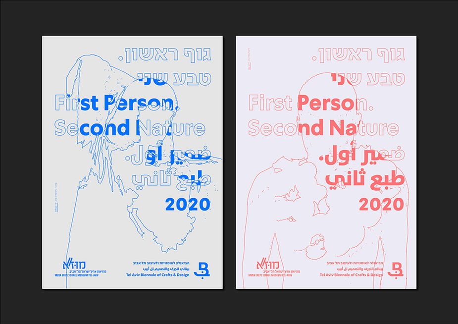 בדרך כלל במעטפת חזותית לתערוכות נעשה ניסיון לשימוש בדימוי מוביל אחד, הרמטי, זכיר ומזוהה. מכיוון שהתערוכה הזו מציגה מעל 250 עבודות, ניסינו לצור שפה מובהקת וזכירה מבחינה חזותית ויחד עם זאת כזו שתאפשר שימוש במגוון דימויים של עבודות. התמה האוצרותית גוף ראשון. טבע שני, ביקשה לבטא מתח בין קטבים רעיוניים ופיזיים ביצירה (טבעי/מלאכותי, מסורתי/אקספרימנטלי וכו'). ההתחקות הסכמטית־רישומית (״טרייסינג״) אחר קווי המתאר של האובייקטים המצולמים והשימוש בהם הייתה למרכיב מרכזי ומזוהה בשפה לצד השימוש במגוון דימויים לצד קוד טיפוגרפי, צבעוני וקומפוזיציוני מודולרי.